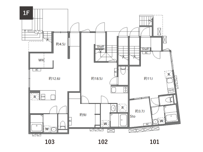 | 1F | 101 1LDK/33.77㎡ | 102 1LDK/39.53㎡ ※SOHO | 103 1LDK/38.90㎡ |