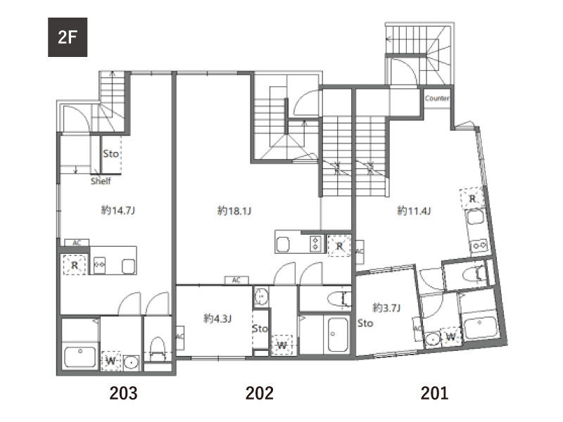 | 2F | 201 1LDK/37.74㎡ | 202 1LDK/48.90㎡ | 203 1LDK/32.73㎡ |