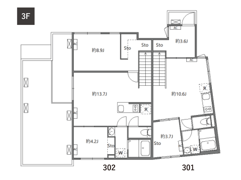 | 3F | 301 2LDK/41.08㎡ | 302 2LDK/64.72㎡ | |